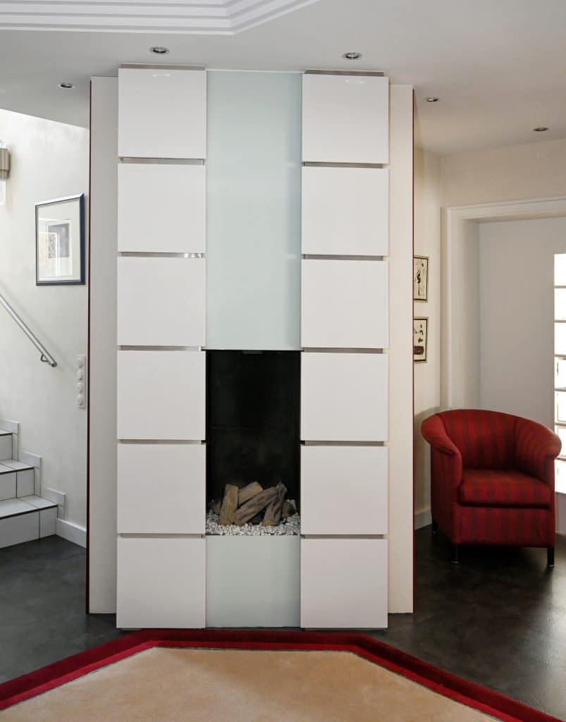 Kaminumbau mit Hochglanzflächen, Keramikplatten und satiniertem Glas.