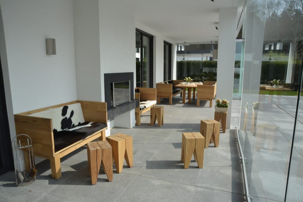 Möbel aus naturbelassener Eiche mit geölter Oberfläche und echten Kuhfellen.